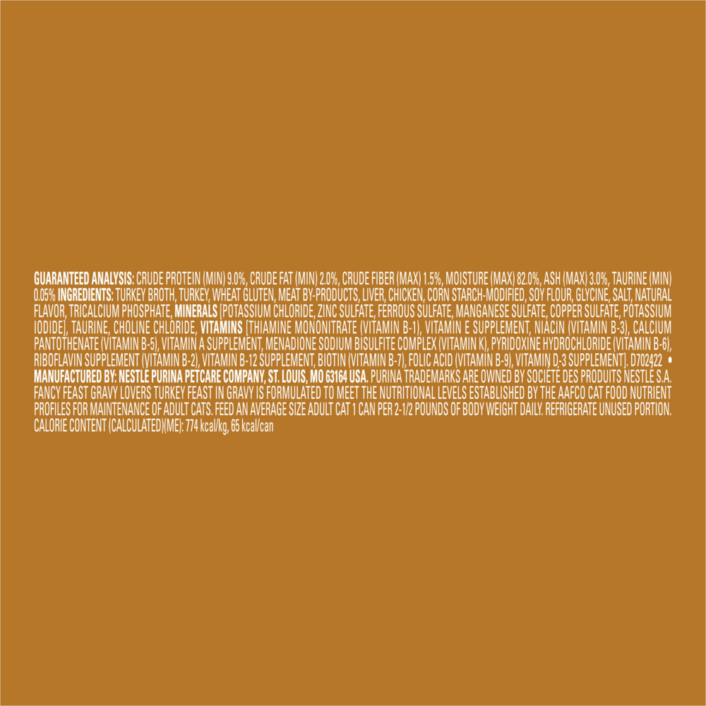 {"id":1853055828083,"title":"Purina Fancy Feast Gravy Lovers Turkey Feast Grilled Gourmet Cat Food in Wet Cat Food Gravy","handle":"fancy-feast-gravy-lovers-turkey-canned-cat-food","description":"Tempting pieces with turkey in a delectable roasted turkey flavor gravy.\u003ch2\u003eIngredients\u003c\/h2\u003ePoultry broth, turkey, liver, wheat gluten, meat by-products, chicken, corn starch-modified, artificial and natural flavors, soy flour, salt, calcium phosphate, potassium chloride, natural roasted turkey flavor, taurine, added color, choline chloride, magnesium sulfate, thiamine mononitrate, Vitamin E supplement, zinc sulfate, ferrous sulfate, niacin, calcium pantothenate, Vitamin A supplement, copper sulfate, menadione sodium bisulfite complex (source of Vitamin K activity), manganese sulfate, pyridoxine hydrochloride, riboflavin supplement, Vitamin B-12 supplement, biotin, folic acid, Vitamin D-3 supplement, potassium iodide.\u003ch2\u003eGuaranteed Analysis\u003c\/h2\u003e\u003ctable\u003e\n\u003ctr\u003e\n\u003cth\u003eNutrient\u003c\/th\u003e\n\u003cth\u003eGuaranteed Units\u003c\/th\u003e\n\u003c\/tr\u003e\n\u003ctr\u003e\n\u003ctd\u003eCrude Protein\u003c\/td\u003e\n\u003ctd\u003e9.0% min\u003c\/td\u003e\n\u003c\/tr\u003e\n\u003ctr\u003e\n\u003ctd\u003eCrude Fat\u003c\/td\u003e\n\u003ctd\u003e2.0% min\u003c\/td\u003e\n\u003c\/tr\u003e\n\u003ctr\u003e\n\u003ctd\u003eCrude Fiber\u003c\/td\u003e\n\u003ctd\u003e1.5% max\u003c\/td\u003e\n\u003c\/tr\u003e\n\u003ctr\u003e\n\u003ctd\u003eMoisture\u003c\/td\u003e\n\u003ctd\u003e82.0% max\u003c\/td\u003e\n\u003c\/tr\u003e\n\u003ctr\u003e\n\u003ctd\u003eAsh\u003c\/td\u003e\n\u003ctd\u003e3.0% max\u003c\/td\u003e\n\u003c\/tr\u003e\n\u003ctr\u003e\n\u003ctd\u003eTaurine\u003c\/td\u003e\n\u003ctd\u003e0.05% min\u003c\/td\u003e\n\u003c\/tr\u003e\n\u003c\/table\u003e","published_at":"2018-12-21T10:36:35-05:00","created_at":"2018-12-20T15:22:21-05:00","vendor":"Fancy Feast","type":"Wet Food","tags":["All Breeds","All Stages","Canned Food","Cat","Contains Grain","Endless Aisles","Fancy Feast","Food","Wet Food"],"price":2294,"price_min":2294,"price_max":2294,"available":true,"price_varies":false,"compare_at_price":null,"compare_at_price_min":0,"compare_at_price_max":0,"compare_at_price_varies":false,"variants":[{"id":18014398677107,"title":"3-oz, case of 24","option1":"3-oz, case of 24","option2":null,"option3":null,"sku":"27728","requires_shipping":true,"taxable":true,"featured_image":null,"available":true,"name":"Purina Fancy Feast Gravy Lovers Turkey Feast Grilled Gourmet Cat Food in Wet Cat Food Gravy - 3-oz, case of 24","public_title":"3-oz, case of 24","options":["3-oz, case of 24"],"price":2294,"weight":2041,"compare_at_price":null,"inventory_management":"endless-aisles-custom-app","barcode":"00050000580057","requires_selling_plan":false,"selling_plan_allocations":[]}],"images":["\/\/shop.safaristanspetcenter.com\/cdn\/shop\/files\/C300797-20251013153908020-1.png?v=1761082032","\/\/shop.safaristanspetcenter.com\/cdn\/shop\/files\/C300797-202510131539180630-10.png?v=1761082032","\/\/shop.safaristanspetcenter.com\/cdn\/shop\/files\/C300797-20251013153909020-2.png?v=1761082032","\/\/shop.safaristanspetcenter.com\/cdn\/shop\/files\/C300797-20251013153910067-3.png?v=1761082032","\/\/shop.safaristanspetcenter.com\/cdn\/shop\/files\/C300797-202510131539100990-4.png?v=1761082032","\/\/shop.safaristanspetcenter.com\/cdn\/shop\/files\/C300797-202510131539120677-5.png?v=1761082032","\/\/shop.safaristanspetcenter.com\/cdn\/shop\/files\/C300797-202510131539130833-6.png?v=1761082032","\/\/shop.safaristanspetcenter.com\/cdn\/shop\/files\/C300797-20251013153915083-7.png?v=1761082032","\/\/shop.safaristanspetcenter.com\/cdn\/shop\/files\/C300797-202510131539160317-8.png?v=1761082032","\/\/shop.safaristanspetcenter.com\/cdn\/shop\/files\/C300797-202510131539170350-9.png?v=1761082032"],"featured_image":"\/\/shop.safaristanspetcenter.com\/cdn\/shop\/files\/C300797-20251013153908020-1.png?v=1761082032","options":["Title"],"media":[{"alt":"Purina Fancy Feast Gravy Lovers Turkey Feast Grilled Gourmet Cat Food in Wet Cat Food Gravy","id":38378361553151,"position":1,"preview_image":{"aspect_ratio":1.0,"height":1000,"width":1000,"src":"\/\/shop.safaristanspetcenter.com\/cdn\/shop\/files\/C300797-20251013153908020-1.png?v=1761082032"},"aspect_ratio":1.0,"height":1000,"media_type":"image","src":"\/\/shop.safaristanspetcenter.com\/cdn\/shop\/files\/C300797-20251013153908020-1.png?v=1761082032","width":1000},{"alt":"Purina Fancy Feast Gravy Lovers Turkey Feast Grilled Gourmet Cat Food in Wet Cat Food Gravy","id":38378361585919,"position":2,"preview_image":{"aspect_ratio":1.0,"height":1000,"width":1000,"src":"\/\/shop.safaristanspetcenter.com\/cdn\/shop\/files\/C300797-202510131539180630-10.png?v=1761082032"},"aspect_ratio":1.0,"height":1000,"media_type":"image","src":"\/\/shop.safaristanspetcenter.com\/cdn\/shop\/files\/C300797-202510131539180630-10.png?v=1761082032","width":1000},{"alt":"Purina Fancy Feast Gravy Lovers Turkey Feast Grilled Gourmet Cat Food in Wet Cat Food Gravy","id":38378361618687,"position":3,"preview_image":{"aspect_ratio":1.0,"height":1000,"width":1000,"src":"\/\/shop.safaristanspetcenter.com\/cdn\/shop\/files\/C300797-20251013153909020-2.png?v=1761082032"},"aspect_ratio":1.0,"height":1000,"media_type":"image","src":"\/\/shop.safaristanspetcenter.com\/cdn\/shop\/files\/C300797-20251013153909020-2.png?v=1761082032","width":1000},{"alt":"Purina Fancy Feast Gravy Lovers Turkey Feast Grilled Gourmet Cat Food in Wet Cat Food Gravy","id":38378361651455,"position":4,"preview_image":{"aspect_ratio":1.0,"height":1000,"width":1000,"src":"\/\/shop.safaristanspetcenter.com\/cdn\/shop\/files\/C300797-20251013153910067-3.png?v=1761082032"},"aspect_ratio":1.0,"height":1000,"media_type":"image","src":"\/\/shop.safaristanspetcenter.com\/cdn\/shop\/files\/C300797-20251013153910067-3.png?v=1761082032","width":1000},{"alt":"Purina Fancy Feast Gravy Lovers Turkey Feas