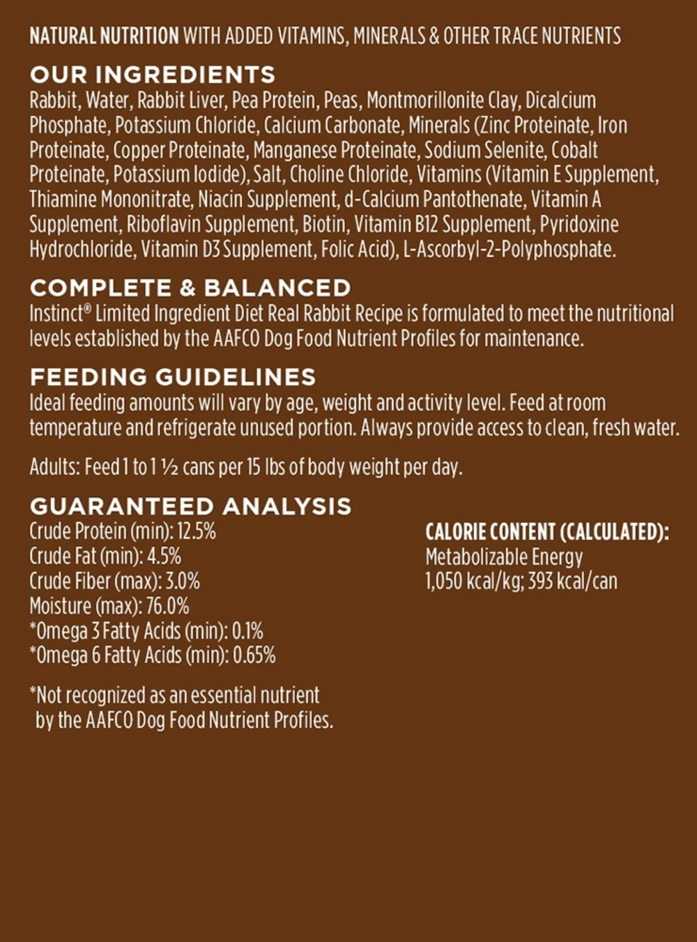{"id":1852938977395,"title":"Instinct Grain Free LID Rabbit Canned Dog Food","handle":"natures-variety-instinct-grain-free-lid-rabbit-canned-dog-food","description":"\u003cp\u003eSensitive digestive systems can be difficult to manage. Nature's Variety is here to help, with Instinct Grain-Free LID Rabbit Canned Dog Food. Made with one single animal protein, high quality rabbit, and highly digestible, simple ingredients, feel good knowing your dog is eating a simple, digestible diet. Free of grains and gluten for extra digestibility, and balanced for all life stages, Instinct LID features only recognizable ingredients in grain-free formulas.\u003cbr\u003e\u003c\/p\u003e\u003ch3\u003eWhy We Love It\u003c\/h3\u003e\u003cul\u003e\n\u003cli\u003eMade with real rabbit\u003c\/li\u003e\n\u003cli\u003eLimited ingredient formula for dogs with sensitive needs\u003c\/li\u003e\n\u003cli\u003eGrain-free and gluten-free recipe\u003c\/li\u003e\n\u003c\/ul\u003e\u003ch3\u003eAbout Instinct\u003c\/h3\u003e\u003cp\u003eInstinct empowers pet owners to to transform the lives of their pets by making proper, holistic nutrition for dogs and cats. Since 2002, Instinct has produced the best nutrition through healthy, natural ingredients in Lincoln, Nebraska. Instinct has led the industry in raw diets through frozen raw, freeze-dried raw, raw boost and grain-free raw inspired formulas that mimic the ancestral diet of high protein, minimally processed lean meats, and zero grains, that dogs and cats thrived on for thousands of years. Instinct's Prairie line provides the best source of nutrition for optimal nourishment and holistic nutrition, made with pure animal protein, whole grains, and fresh vegetables and fruits, with a freeze-dried raw coating for added nutrition and taste. Made with integrity and care in the USA, a 100% satisfaction guarantee is a proud piece of the Instinct promise.\u003c\/p\u003e\u003ch2\u003eIngredients\u003c\/h2\u003eRabbit, Water, Rabbit Liver, Pea Protein, Peas, Montmorillonite Clay, Dicalcium Phosphate, Potassium Chloride, Calcium Carbonate, Minerals (Zinc Proteinate, Iron Proteinate, Copper Proteinate, Manganese Proteinate, Sodium Selenite, Cobalt Proteinate, Potassium Iodide), Salt, Choline Chloride, Vitamins (Vitamin E Supplement, Thiamine Mononitrate, Niacin Supplement, d-Calcium Pantothenate, Vitamin A Supplement, Riboflavin Supplement, Biotin, Vitamin B12 Supplement, Pyridoxine Hydrochloride, Vitamin D3 Supplement, Folic Acid), L-Ascorbyl-2-Polyphosphate\u003ch2\u003eGuaranteed Analysis\u003c\/h2\u003e\u003ctable\u003e\n\u003ctr\u003e\n\u003cth\u003eNutrient\u003c\/th\u003e\n\u003cth\u003eGuaranteed Units\u003c\/th\u003e\n\u003c\/tr\u003e\n\u003ctr\u003e\n\u003ctd\u003eCrude Protein\u003c\/td\u003e\n\u003ctd\u003e10.0% min\u003c\/td\u003e\n\u003c\/tr\u003e\n\u003ctr\u003e\n\u003ctd\u003eCrude Fat\u003c\/td\u003e\n\u003ctd\u003e4.50% min\u003c\/td\u003e\n\u003c\/tr\u003e\n\u003ctr\u003e\n\u003ctd\u003eCrude Fiber\u003c\/td\u003e\n\u003ctd\u003e3.00% max\u003c\/td\u003e\n\u003c\/tr\u003e\n\u003ctr\u003e\n\u003ctd\u003eMoisture\u003c\/td\u003e\n\u003ctd\u003e78.00% max\u003c\/td\u003e\n\u003c\/tr\u003e\n\u003ctr\u003e\n\u003ctd\u003eCalcium\u003c\/td\u003e\n\u003ctd\u003e.40% min\u003c\/td\u003e\n\u003c\/tr\u003e\n\u003ctr\u003e\n\u003ctd\u003ePhosphorus\u003c\/td\u003e\n\u003ctd\u003e.37% min\u003c\/td\u003e\n\u003c\/tr\u003e\n\u003ctr\u003e\n\u003ctd\u003eVitamin E\u003c\/td\u003e\n\u003ctd\u003e26.67 IU\/kg min\u003c\/td\u003e\n\u003c\/tr\u003e\n\u003ctr\u003e\n\u003ctd\u003eOmega-6 Fatty Acids\u003c\/td\u003e\n\u003ctd\u003e.65% min\u003c\/td\u003e\n\u003c\/tr\u003e\n\u003c\/table\u003e","published_at":"2018-12-22T11:53:04-05:00","created_at":"2018-12-20T14:18:37-05:00","vendor":"Nature's Variety","type":"","tags":["All Breeds","All Stages","Canned Food","Digestive \u0026 Urinary","Dog","Endless Aisles","Food","Gluten-Free","Grain-Free","Instinct","Limited Ingredient Diet","Wet Food"],"price":3594,"price_min":3594,"price_max":3594,"available":false,"price_varies":false,"compare_at_price":null,"compare_at_price_min":0,"compare_at_price_max":0,"compare_at_price_varies":false,"variants":[{"id":18014188994675,"title":"13.2-oz, case of 6","option1":"13.2-oz, case of 6","option2":null,"option3":null,"sku":"44071","requires_shipping":true,"taxable":true,"featured_image":null,"available":false,"name":"Instinct Grain Free LID Rabbit Canned Dog Food - 13.2-oz, case of 6","public_title":"13.2-oz, case of 6","options":["13.2-oz, case of 6"],"price":3594,"weight":2245,"compare_at_price":null,"inventory_management":"endless-aisles-custom-app","barcode":"769949507512","requires_selling_plan":false,"selling_plan_allocations":[]}],"images":["\/\/shop.safaristanspetcenter.com\/cdn\/shop\/files\/C301500-202509250346510200-1.png?v=1761083340","\/\/shop.safaristanspetcenter.com\/cdn\/shop\/files\/C301500-202509250346520280-2.png?v=1761083340","\/\/shop.safaristanspetcenter.com\/cdn\/shop\/files\/C301500-202509250346530217-3.png?v=1761083340"],"featured_image":"\/\/shop.safaristanspetcenter.com\/cdn\/shop\/files\/C301500-202509250346510200-1.png?v=1761083340","options":["Title"],"media":[{"alt":"Instinct Grain Free LID Rabbit Canned Dog Food","id":38378441769215,"position":1,"preview_image":{"aspect_ratio":0.672,"height":1488,"width":1000,"src":"\/\/shop.safaristanspetcenter.com\/cdn\/shop\/files\/C301500-202509250346510200-1.png?v=1761083340"},"aspect_ratio":0.672,"height":1488,"media_type":"image","src":"\/\/shop.safaristanspetcenter.com\/cdn\/shop\/files\/C301500-202509250346510200-1.png?v=1761083340","width":1000},{"alt":"Instinct Grain Free LID Rabbit Canned Dog Food","id":38378441801983,"position":2,"preview_image":{"aspect_ratio":1.0,"height":1000,"width":1000,"src":"\/\/shop.safaristanspetcenter.com\/cdn\/shop\/files\/C301500-202509250346520280-2.png?v=1761083340"},"aspect_ratio":1.0,"height":1000,"media_type":"image","src":"\/\/shop.safaristanspetcenter.com\/cdn\/shop\/files\/C301500-20250925