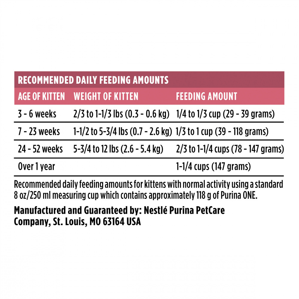 {"id":1852968075379,"title":"Purina ONE +Plus Healthy Kitten Dry Cat Food","handle":"purina-one-kitten-growth-and-development-dry-cat-food","description":"Give your growing kitten the nutrition she needs and a taste she loves when you serve Purina ONE Healthy Kitten Formula dry cat food. Real chicken as the first ingredient gives your budding feline the delectable taste cats love while providing her with the high-quality protein you demand from a veterinarian-recommended brand. This natural kitten formula plus essential nutrients is crafted with accents of real vegetables, including real carrots and peas, and without artificial flavors or preservatives. It's made with DHA, a nutrient found in mother's milk, which assists with brain and vision development. This formula also has an antioxidant-rich blend of vitamins E and A and other nutrients that help support a strong immune system. Your little friend is sure to love the enticing texture of the crunchy kibble, and you can feel good about giving her 100% complete and balanced nutrition for kittens to help support her overall health and wellness.Show your kitten just how much she means to you by filling her dish with Purina ONE Healthy Kitten Formula dry cat food. With 46 grams of protein per cup, this kitten food helps support her strong muscles, including a healthy heart. Kittens love the texture of this tasty recipe, which is crafted with real ingredients like real chicken, wholesome grains and accents of real vegetables. The crunchy kibble helps reduce plaque buildup and whiten teeth. Omega-6 fatty acids in every serving help give your kitten a radiant coat and healthy skin, and the formula is highly-digestible, so more nutrition goes to work inside your cat. Because it's made with 0% fillers, this dry kitten food ensures all of our high-quality ingredients have a purpose. Kittens generally nibble solid foods at three to four weeks of age. Keep moistened Purina ONE available to these kittens at all times. After weaning, at six to eight weeks of age, kittens normally eat dry or moistened food at will. Add variety to her diet with our menu of Purina ONE wet cat foods, including Purina ONE True Instinct Turkey Recipe in Gravy. Giving your cat the nutrition she needs to be happy and healthy is your first concern, and Purina ONE dry kitten food does just that. We craft this recipe in our U.S. facilities, so you know exactly where her meals are made. In a typical 24-hour production, Nestle Purina conducts 30,000 quality checks, so you know your precious kitten is getting the delicious and nutritious food she deserves. We formulate this Purina ONE recipe to meet or exceed all state and federal guidelines for pet food, and we put quality first in everything we do. Offer Purina ONE Healthy Kitten Formula dry cat food to your furry friend, and watch as she devours every last scrumptious bite.\u003ch2\u003eIngredients\u003c\/h2\u003eChicken, Chicken By-Product Meal, Corn Gluten Meal, Rice Flour, Soybean Meal, Beef Fat Naturally Preserved With Mixed-Tocopherols, Chicken Meal, Whole Grain Corn, Soy Protein Concentrate, Liver Flavor, Soy Protein Isolate, Phosphoric Acid, Salt, Caramel Color, Fish Oil, Dried Carrots, Dried Peas, Choline Chloride, Taurine, Minerals [Zinc Sulfate, Ferrous Sulfate, Manganese Sulfate, Copper Sulfate, Calcium Iodate, Sodium Selenite], Potassium Chloride, Calcium Carbonate, Vitamins [Vitamin E Supplement, Niacin (Vitamin B-3), Vitamin A Supplement, Calcium Pantothenate (Vitamin B-5), Thiamine Mononitrate (Vitamin B-1), Riboflavin Supplement (Vitamin B-2), Vitamin B-12 Supplement, Pyridoxine Hydrochloride (Vitamin B-6), Folic Acid (Vitamin B-9), Vitamin D-3 Supplement, Biotin (Vitamin B-7), Menadione Sodium Bisulfite Complex (Vitamin K)], L-Lysine Monohydrochloride, Dl-Methionine.\u003ch2\u003eGuaranteed Analysis\u003c\/h2\u003e\u003ctable\u003e\n\u003ctr\u003e\n\u003cth\u003eNutrient\u003c\/th\u003e\n\u003cth\u003eGuaranteed Units\u003c\/th\u003e\n\u003c\/tr\u003e\n\u003ctr\u003e\n\u003ctd\u003eCrude Protein\u003c\/td\u003e\n\u003ctd\u003e40.0% min\u003c\/td\u003e\n\u003c\/tr\u003e\n\u003ctr\u003e\n\u003ctd\u003eCrude Fat\u003c\/td\u003e\n\u003ctd\u003e18.0% min\u003c\/td\u003e\n\u003c\/tr\u003e\n\u003ctr\u003e\n\u003ctd\u003eCrude Fiber\u003c\/td\u003e\n\u003ctd\u003e2.5% max\u003c\/td\u003e\n\u003c\/tr\u003e\n\u003ctr\u003e\n\u003ctd\u003eMoisture\u003c\/td\u003e\n\u003ctd\u003e12.0% max\u003c\/td\u003e\n\u003c\/tr\u003e\n\u003ctr\u003e\n\u003ctd\u003eLinoleic Acid\u003c\/td\u003e\n\u003ctd\u003e1.8% min\u003c\/td\u003e\n\u003c\/tr\u003e\n\u003ctr\u003e\n\u003ctd\u003eCalcium\u003c\/td\u003e\n\u003ctd\u003e1.0% min\u003c\/td\u003e\n\u003c\/tr\u003e\n\u003ctr\u003e\n\u003ctd\u003ePhosphorus\u003c\/td\u003e\n\u003ctd\u003e0.8% min\u003c\/td\u003e\n\u003c\/tr\u003e\n\u003ctr\u003e\n\u003ctd\u003eZinc\u003c\/td\u003e\n\u003ctd\u003e150 ppm min\u003c\/td\u003e\n\u003c\/tr\u003e\n\u003ctr\u003e\n\u003ctd\u003eSelenium\u003c\/td\u003e\n\u003ctd\u003e0.35 ppm min\u003c\/td\u003e\n\u003c\/tr\u003e\n\u003ctr\u003e\n\u003ctd\u003eVitamin A\u003c\/td\u003e\n\u003ctd\u003e10,000 IU\/kg min\u003c\/td\u003e\n\u003c\/tr\u003e\n\u003ctr\u003e\n\u003ctd\u003eVitamin D\u003c\/td\u003e\n\u003ctd\u003e1,500 IU\/kg min\u003c\/td\u003e\n\u003c\/tr\u003e\n\u003c\/table\u003e","published_at":"2018-12-22T11:52:24-05:00","created_at":"2018-12-20T14:35:46-05:00","vendor":"Purina ONE","type":"","tags":["All Breeds","Cat","Contains Grain","Dry Food","Endless Aisles","Food","Growth","Kitten","Purina ONE"],"price":3446,"price_min":3446,"price_max":3446,"available":true,"price_varies":false,"compare_at_price":null,"compare_at_price_min":0,"compare_at_price_max":0,"compare_at_price_varies":false,"variants":[{"id":18014253711475,"title":"16-lb","option1":"16-lb","option2":null,"option3":null,"sku":"27770","requires_shipping":true,"taxable":true,"featured_image":null,"available":true,"name":"Purina ONE +Plus Healthy Kitten Dry Cat Food - 16-lb","public_tit