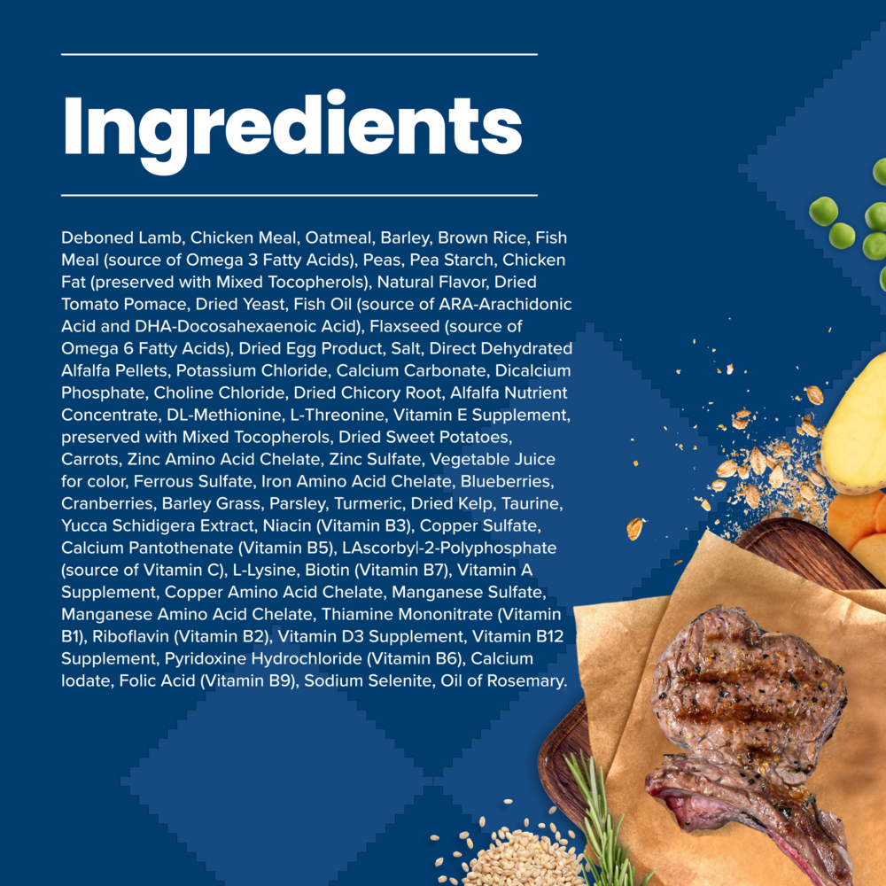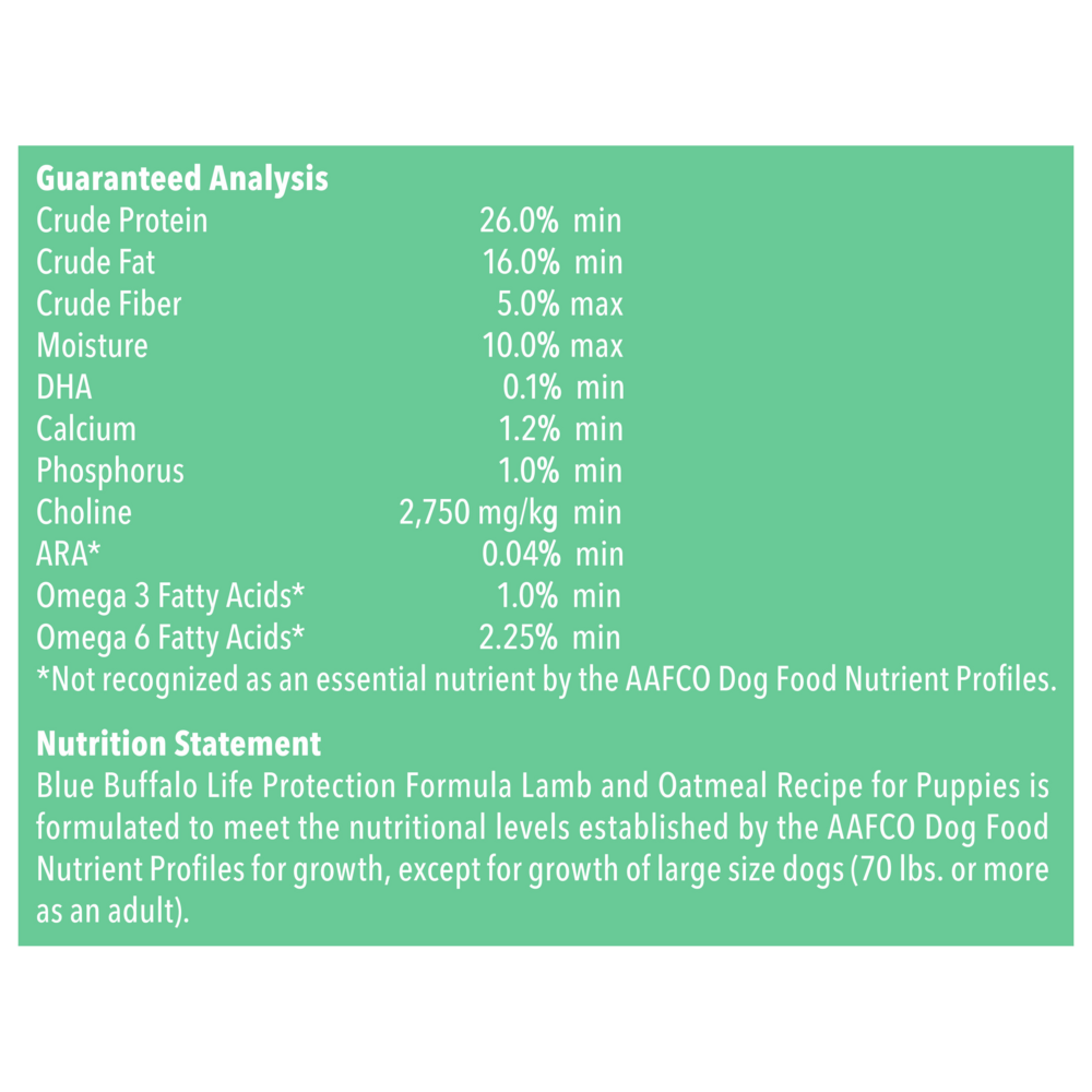 {"id":1853005135987,"title":"Blue Buffalo Life Protection Formula Puppy Lamb \u0026 Oatmeal Recipe Dry Dog Food","handle":"blue-buffalo-life-protection-puppy-lamb-and-oatmeal-recipe-dry-dog-food","description":"\u003cp\u003eBecause puppyhood is such an important stage in any dog\u0026amp;CloseCurlyQuote;s life, BLUE Life Protection Formula for puppies features ingredients that support the healthy growth and development of puppies. It contains the ingredients you\u0026amp;CloseCurlyQuote;ll love feeding as much as they\u0026amp;CloseCurlyQuote;ll love eating. BLUE Life Protection Formula dog food is a product of the Blue Buffalo company. Based in the United States, Blue Buffalo makes premium-quality pet foods featuring real meat, fruit and vegetables.\u003cbr\u003e\u003c\/p\u003e\u003ch3\u003eWhy We Love It\u003c\/h3\u003e\u003cul\u003e\n\u003cli\u003eREAL MEAT FIRST: Blue Buffalo foods always feature real meat as the first ingredient. High-quality protein from real lamb helps your dog build and maintain healthy muscles. Plus they contain wholesome whole grains, garden veggies and fruit.\u003c\/li\u003e\n\u003cli\u003eFOR PUPPY DOGS: Specially formulated for puppies, BLUE Life Protection Formula\u0026amp;REG; Puppy Food contains DHA and ARA (important fatty acids found in mother\u0026amp;CloseCurlyQuote;s milk) to support cognitive function and retinal health.\u003c\/li\u003e\n\u003cli\u003eWITH LIFESOURCE BITS\u0026amp;REG;: This formula contains BLUE\u0026amp;CloseCurlyQuote;s exclusive LifeSource Bits – a precise blend of antioxidants, vitamins and minerals carefully selected by holistic veterinarians and animal nutritionists, to support immune system health, life stage requirements, and a healthy oxidative balance.\u003c\/li\u003e\n\u003cli\u003eA NATURAL DOG FOOD: BLUE dry dog foods are made with the finest natural ingredients enhanced with vitamins and minerals. BLUE contains NO chicken (or poultry) by-product meals, corn, wheat, soy, artificial flavors or preservatives.\u003c\/li\u003e\n\u003c\/ul\u003e\u003cp\u003e\u003cbr\u003e\u003c\/p\u003e\u003ch3\u003eAbout Blue Buffalo\u003c\/h3\u003e\u003cp\u003eBLUE Buffalo's True Blue promise is the pillar of their business, straight to every customer; the finest natural ingredients, and no chicken\/poultry by-product meals, corn, wheat, soy, artificial preservatives, colors or flavors. BLUE Buffalo is the only food made with unique Lifesource Bits; a precise blend of vitamins, minerals and antioxidants created by veterinarians and animal nutritionists. With recipes for all tastes and diets, including limited ingredient diets, high protein, grain-free, wholesome grains, and exotic proteins, BLUE Buffalo always starts with real meat, and ends with good health.\u003c\/p\u003e\u003ch2\u003eIngredients\u003c\/h2\u003eDeboned Lamb, Menhaden Fish Meal (source of Omega 3 Fatty Acids),Oatmeal,Brown Rice,Barley,Pea Starch,Lamb Meal,Pea Protein,Dried Egg Product,Peas,Natural Flavor,Chicken Fat (preserved with Mixed Tocopherols),Flaxseed (source of Omega 6 Fatty Acids),Dried Tomato Pomace,Fish Oil (source of ARA-Arachidonic Acid and DHA-Docosahexaenoic Acid),Dehydrated Alfalfa Meal,Salt,Choline Chloride,Potatoes,Dried Chicory Root, Pea Fiber,Alfalfa Nutrient Concentrate,Potassium Chloride,Calcium Carbonate,L-Threonine,preserved with Mixed Tocopherols,Sweet Potatoes,Carrots,DL-Methionine,Garlic,Zinc Amino Acid Chelate,Zinc Sulfate,Vegetable Juice for color,Ferrous Sulfate,Vitamin E Supplement,Iron Amino Acid Chelate,Blueberries,Cranberries,Barley Grass,Parsley,Yucca Schidigera Extract,Dried Kelp,Turmeric,Niacin (Vitamin B3),Calcium Pantothenate (Vitamin B5),L-Ascorbyl-2-Polyphosphate (source of Vitamin C),L-Carnitine,L-Lysine,Copper Sulfate,Biotin (Vitamin B7),Vitamin A Supplement,Copper Amino Acid Chelate,Manganese Sulfate,Taurine,Manganese Amino Acid Chelate,Thiamine Mononitrate (Vitamin B1),Riboflavin (Vitamin B2),Vitamin D3 Supplement,Vitamin B12 Supplement,Pyridoxine Hydrochloride (Vitamin B6),Calcium Iodate,Dried Yeast,Dried Enterococcus faecium fermentation product,Dried Lactobacillus acidophilus fermentation product,Dried Aspergillus niger fermentation extract,Dried Trichoderma longibrachiatum fermentation extract,Dried Bacillus subtilis fermentation extract,Folic Acid (Vitamin B9),Sodium Selenite,Oil of Rosemary\u003ch2\u003eGuaranteed Analysis\u003c\/h2\u003e\u003ctable\u003e\n\u003ctr\u003e\n\u003cth\u003eNutrient\u003c\/th\u003e\n\u003cth\u003eGuaranteed Units\u003c\/th\u003e\n\u003c\/tr\u003e\n\u003ctr\u003e\n\u003ctd\u003eCrude Protein\u003c\/td\u003e\n\u003ctd\u003e26% min\u003c\/td\u003e\n\u003c\/tr\u003e\n\u003ctr\u003e\n\u003ctd\u003eCrude Fat\u003c\/td\u003e\n\u003ctd\u003e16% min\u003c\/td\u003e\n\u003c\/tr\u003e\n\u003ctr\u003e\n\u003ctd\u003eCrude Fiber\u003c\/td\u003e\n\u003ctd\u003e5% max\u003c\/td\u003e\n\u003c\/tr\u003e\n\u003ctr\u003e\n\u003ctd\u003eMoisture\u003c\/td\u003e\n\u003ctd\u003e10% max\u003c\/td\u003e\n\u003c\/tr\u003e\n\u003ctr\u003e\n\u003ctd\u003eCalcium\u003c\/td\u003e\n\u003ctd\u003e1.2% min\u003c\/td\u003e\n\u003c\/tr\u003e\n\u003ctr\u003e\n\u003ctd\u003ePhosphorus\u003c\/td\u003e\n\u003ctd\u003e1% min\u003c\/td\u003e\n\u003c\/tr\u003e\n\u003ctr\u003e\n\u003ctd\u003eOmega-3 Fatty Acids\u003c\/td\u003e\n\u003ctd\u003e1% min\u003c\/td\u003e\n\u003c\/tr\u003e\n\u003ctr\u003e\n\u003ctd\u003eOmega-6 Fatty Acids\u003c\/td\u003e\n\u003ctd\u003e2.25% min\u003c\/td\u003e\n\u003c\/tr\u003e\n\u003ctr\u003e\n\u003ctd\u003eCholine\u003c\/td\u003e\n\u003ctd\u003e2,750 mg\/kg min\u003c\/td\u003e\n\u003c\/tr\u003e\n\u003ctr\u003e\n\u003ctd\u003eDHA\u003c\/td\u003e\n\u003ctd\u003e.10% min\u003c\/td\u003e\n\u003c\/tr\u003e\n\u003ctr\u003e\n\u003ctd\u003eARA\u003c\/td\u003e\n\u003ctd\u003e.04% min\u003c\/td\u003e\n\u003c\/tr\u003e\n\u003c\/table\u003e","published_at":"2018-12-22T11:51:34-05:00","created_at":"2018-12-20T14:55:19-05:00","vendor":"Blue Buffalo","type":"","tags":["All Breeds","Blue Buffalo","Contains Grain","Co